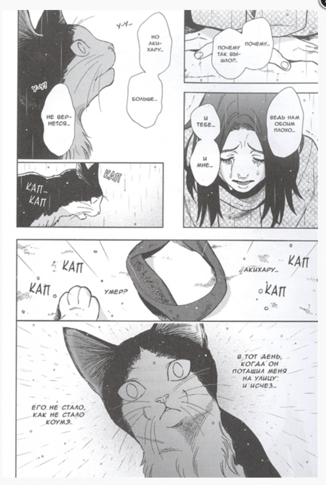 Интересная, милая, добрая история про то, как домашний котик стал уличным. История очень трогательная, потому что описывается уличная жизнь бездомных кошек и непосредственно факт того, как главный герой стал бездомным. Были моменты, над которыми я плакала, так что будьте готовы к этому. Нарисована в стиле классической манги, очень красиво! Читается на одном дыхании, но грустно, очень грустно