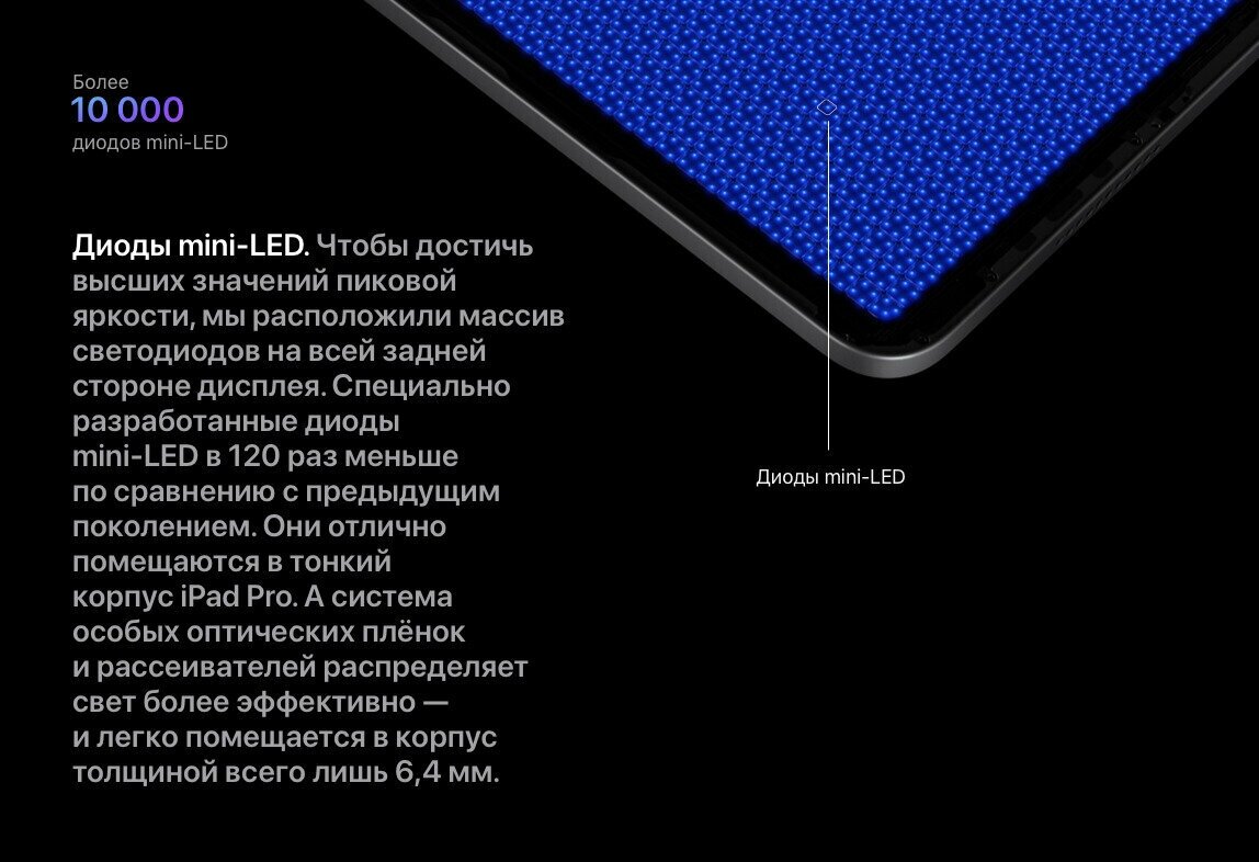 | Особенности | поддержка стилуса Apple Pencil; поддержка технологий ProMotion, True Tone; широкий цветовой охват (P3); сканер LiDAR; поддержка Face ID, TrueDepth; порт Thunderbolt 3/USB 4; функция камеры «В центре внимания» |