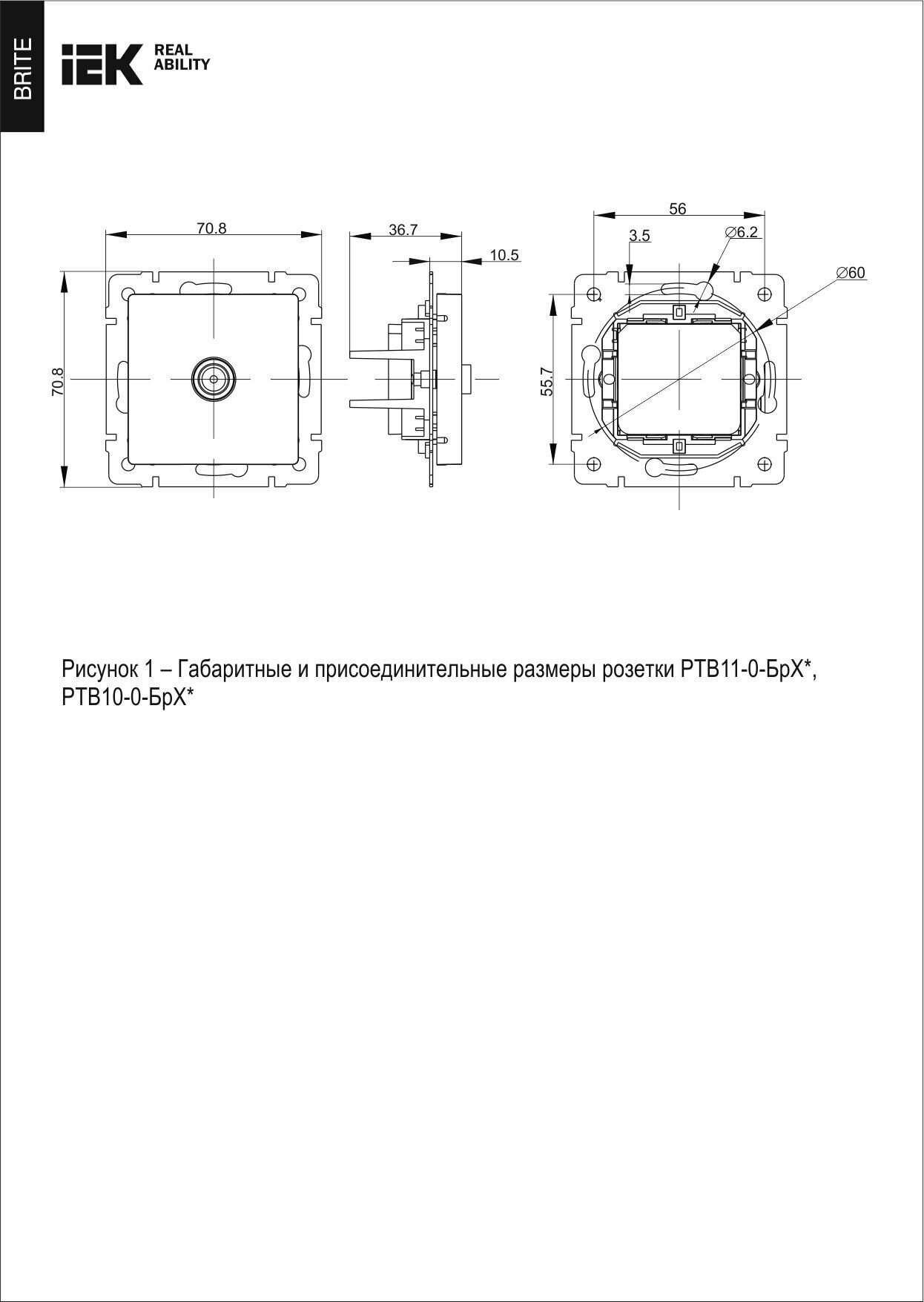 **Розетка TV встраиваемая оконечная IEK Brite РТВ11-0-БрБ** используется для подключения телевизора к телевизионной или спутниковой сети. Подходит как для вертикальной, так и для горизонтальной установки. Может устанавливаться в жилых комнатах, офисах или общественных учреждениях. За счет встраиваемого типа монтажа можно аккуратно вписать розетку в интерьер.