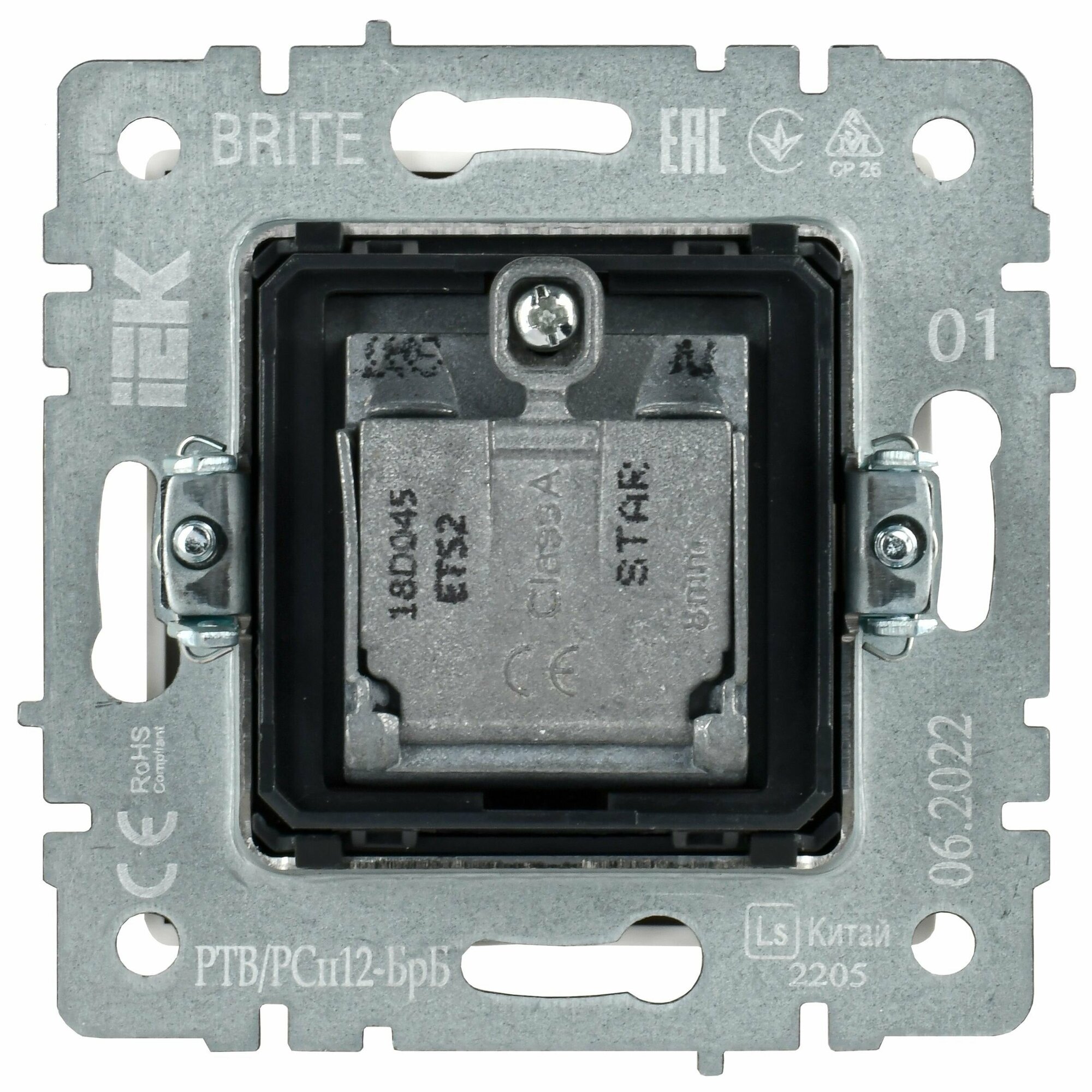 **Телефонная розетка IEK Brite РТВ/РСп12-БрБ** предназначена для встроенного монтажа. Применяется для подключения модемов и факсов, мини-АТС, проводных и беспроводных аппаратов к сети, обеспечивает работу телефонной связи. С помощью телефонной розетки можно отключить аппарат и быстро подключить его к сети в другой комнате.