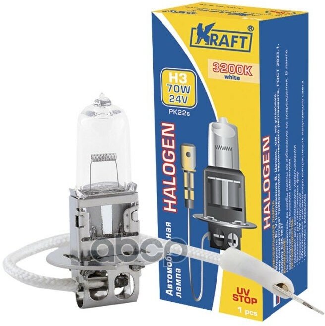 Лампа автомобильная галогенная Kraft KT 700008 типоразмер H3, напряжение 24В, мощность 70Вт, цветовая тепмпература 3200K, в упаковке 1шт.