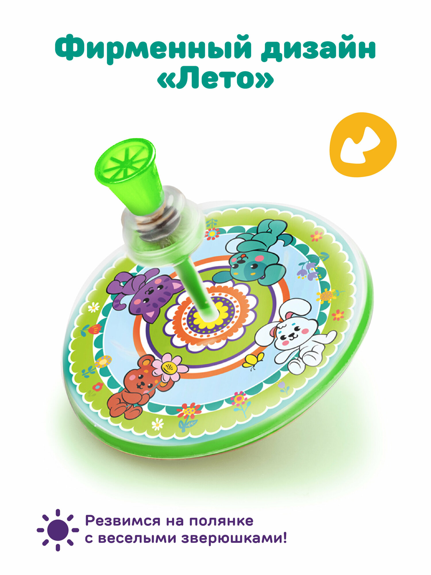 Яркая юла Лето от торговой марки Жирафики - увлекательная игрушка для малышей, способная надолго привлечь их внимание. Конструкция юлы несильно отличается от стандартной и функционал у игрушки остался тот же - необходимо движением руки пустить юлу крутиться вокруг своей оси. Изделие с яркими рисунками во время кручения станет ярким пятном с постепенно проявляющимися изображениями зверят.