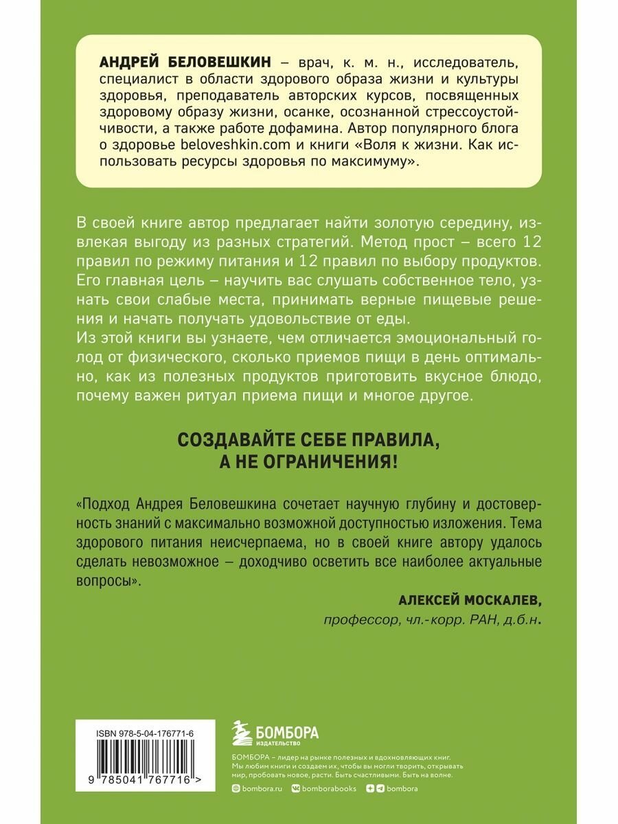Автор книги, врач, к. м. н., преподаватель, Андрей Беловешкин призывает придерживаться простых правил, которые помогут найти золотую середину среди научных советов, традиционного питания и личных особенностей. Каждое правило представлено гибко, чтобы любой человек мог самостоятельно его использовать. Следуя им, вы научитесь понимать, как работает ваш организм, и сможете применять эти знания на практике. В книге представлены 12 правил по режиму питания и 12 правил выбора продуктов.