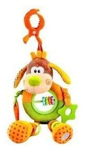 Такую игрушку можно легко подвесить к бортику детской кроватки, к коляске или к автокреслу с помощью прищепки. Игрушка сделана из тканей разного цвета и разной фактуры. Гладкие, ворсистые и вязаные ткани использованы при создании элементов игрушки с целью развития тактильных ощущений малыша. Мягкие фактурные прорезыватели на передних лапках щенка помогут малышу во время прорезывания зубов. На задних лапках - цветные пластмассовые колечки. На одной лапке - безопасное зеркальце, внутри другой лапки - шуршалка. Живот малыша сделан в виде пластмассовой перекладины с разноцветными бусинами. Бусины можно передвигать пальчиками. Рекомендованный возраст: 1+ мес.
