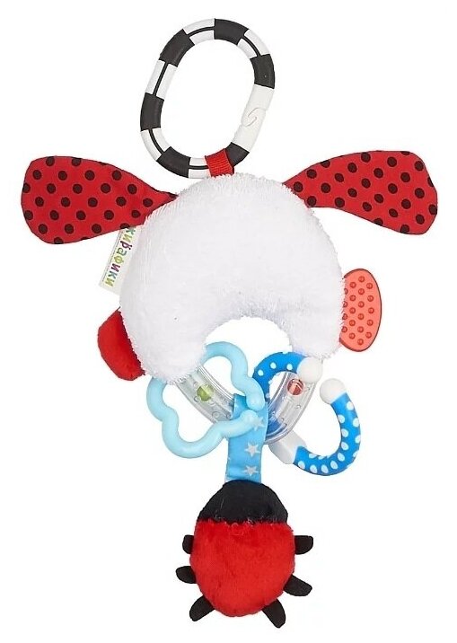 Эту подвеску можно прикрепить к бортику кроватки или к ручке детского автокресла с помощью колечка. Подвеска сделана из тканей разного цвета и разной фактуры. Гладкие и ворсистые ткани использованы при создании элементов игрушки для развития тактильных ощущений малыша. При встряхивании игрушки шарики в пластиковой дуге перемещаются и гремят. Внутри божьей коровки - пищалка. Одна лапка у щенка сделана в виде пластикового фактурного прорезывателя, который пригодится малышу в период роста первых зубов. Еще один прорезыватель в виде колечка висит на пластиковой дуге. Рекомендованный возраст: 1+ мес.