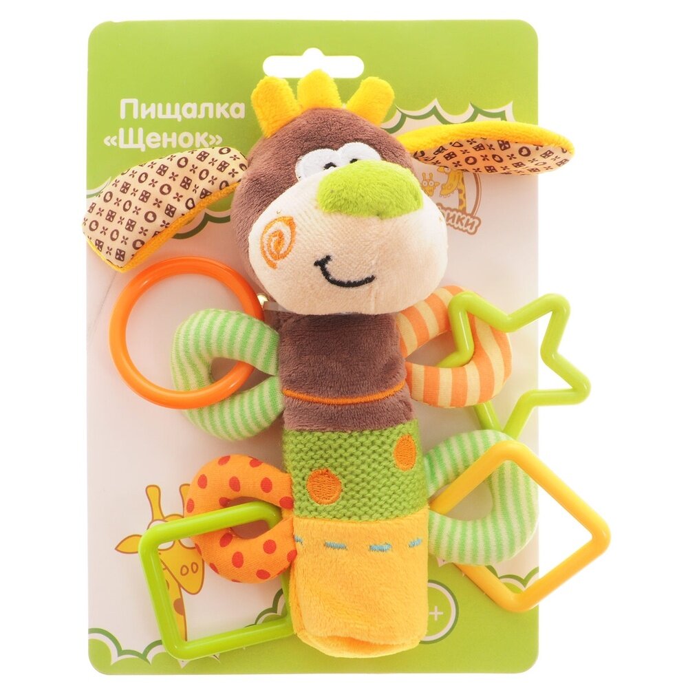 Игрушка Жирафики Щенок с пищалкой - это симпатичная игрушка, которая станет прекрасным подарком для вашего младенца. Внутри ее туловища спрятан сюрприз, веселая и звонкая пищалка. Лапки щенка - это разноцветные фигурные прорезыватели для молочных зубов малыша. Особенности: Внутри туловища у этих симпатичных игрушек спрятан сюрприз — веселая и звонкая пищалка. Лапки Мишки — это разноцветные фигурные прорезыватели для молочных зубов малыша. Изготовлена игрушка из высококачественных и безопасных материалов, поэтому подойдет для игры самых маленьких. Размеры: 16х5х22 см