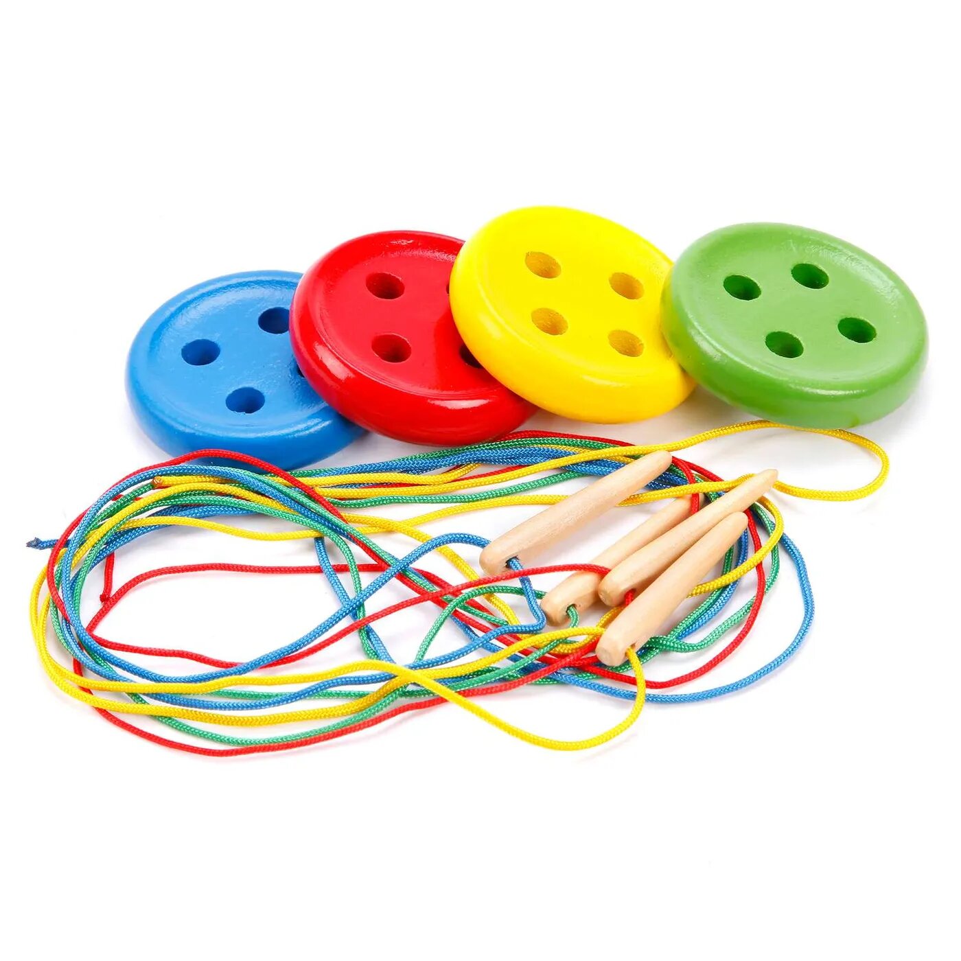 Пуговички – необычная игра-шнуровка для малышей. Продевать нитку в дырочки разноцветных пуговиц можно несколькими способами: крест-накрест, восьмеркой, квадратиком, зигзагом или же придумать свой вариант стежка! Игра поможет малышу тренировать мелкую моторику рук, координацию движений, воображение и логическое мышление, а также воспитает в нем усидчивость и способность концентрировать внимание. Диаметр каждой пуговки - 5,5 см. Игрушка подходит для мальчиков и девочек в возрасте от 3-х лет. Изготовлено из натуральной древесины.