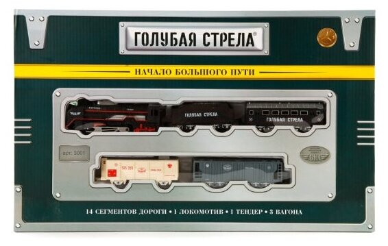 Существует множество детских игрушек, но среди них есть такие, которые не могут оставить равнодушными ни малышей, ни взрослых. Это наборы железных дорог. Эти игрушки привлекают внимание и поражают воображение своими масштабами, разнообразием, комплектацией. Данная модель «Голубой стрелы» представляет собой классический набор железной дороги, состоящий из паровоза, тендера с углем и 3 вагонов, а также элементов пути (272 см., колея 16 мм.). Поезд работает от 2 батареек типа АА. Чтобы его «отправить в путь», достаточно вставить элементы питания в отсек паровоза и переключатель поставить в положение «вкл». И, готово! Можно наслаждаться игрой.