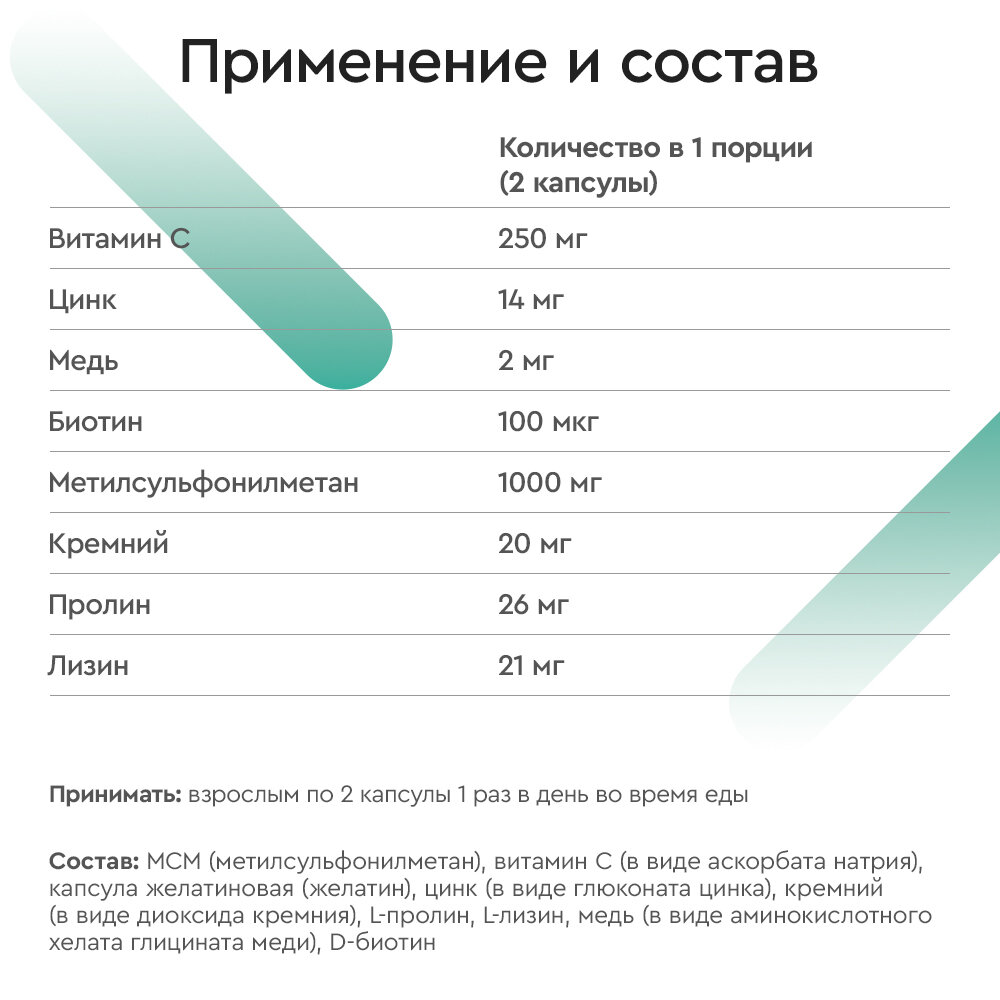 | Состав | МСМ (Метилсульфонилметан), цинк (глюконат цинка), медь (глицинат меди), кремний, l-пролин, l-лизин, витамин С (аскорбат натрия), биотин, капсула (желатин, вода) |