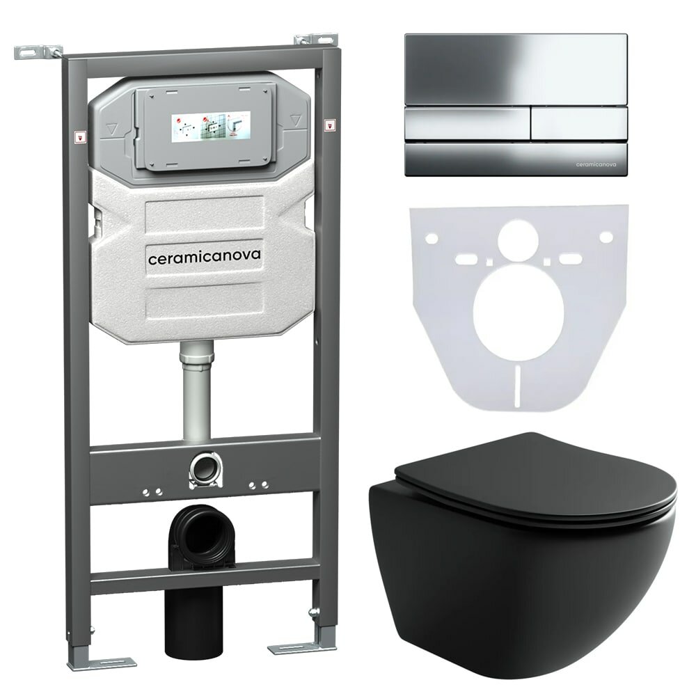Унитаз с инсталляцией Nova Metropol CN4002MB_1002CH_1000.Сет 4 в 1: Подвесной унитаз Metropol Rimless арт. CN4002MB + Шумоизоляционная панель для инсталляции арт. CN1000 + Система инсталляции для унитазов CERAMICANOVA Envision с кнопкой смыва Flat цвет хром, креплениями, арт. CN1002CH