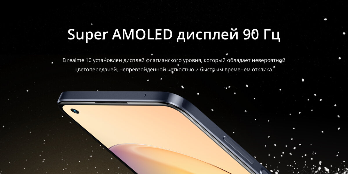 В realme 10 установлен Super AMOLED-дисплей флагманского уровня, который обладает непревзойденной четкостью, невероятной цветопередачей и быстрым временем отклика.