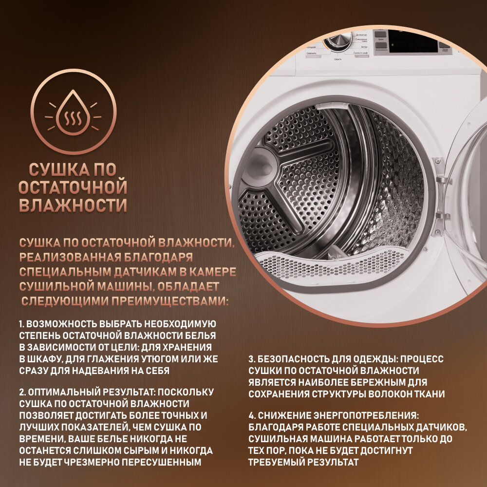 | Особенности | Сушка по остаточной влажности. Бесшумный режим. |