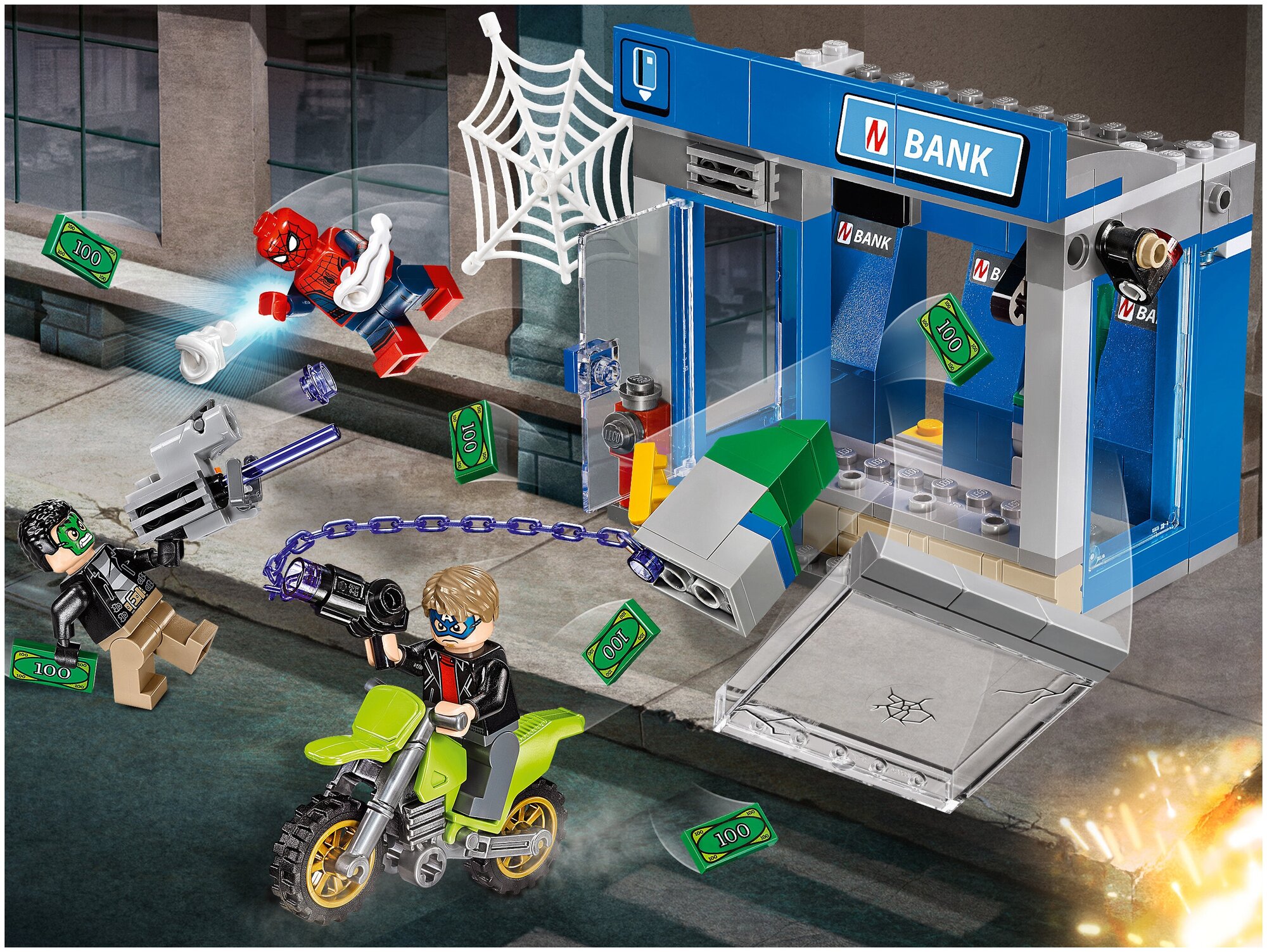 Бандиты пытаются ограбить банкомат, объедините силы с Человеком-пауком, чтобы им помешать! Не дайте людям в масках Халка и Капитана Америка себя обмануть — под масками скрываются преступники. Пока они пытаются ограбить банкомат при помощи гибридного шипомёта и пистолета с цепью, купюры разлетаются повсюду. Карабкайтесь по стенам зданий и стреляйе из мощных бластеров Человека-паука. Поймайте бандитов прежде, чем они сумеют скрыться с деньгами на мотоцикле!