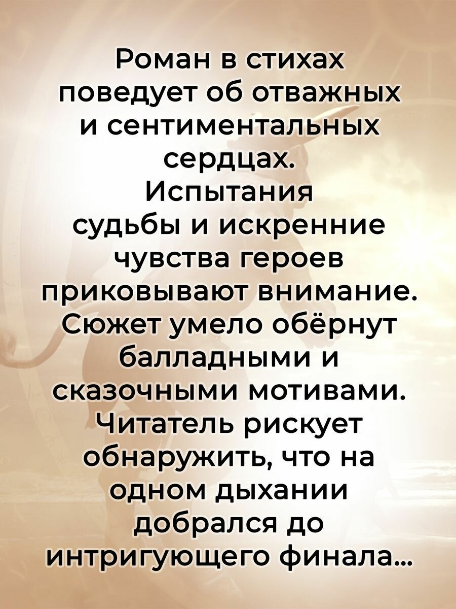 Роман в стихах поведает об отважных и сентиментальных сердцах. Испытания судьбы и искренние чувства героев приковывают внимание. Сюжет умело обёрнут балладными и сказочными мотивами. Читатель рискует обнаружить, что на одном дыхании добрался до интригующего финала…