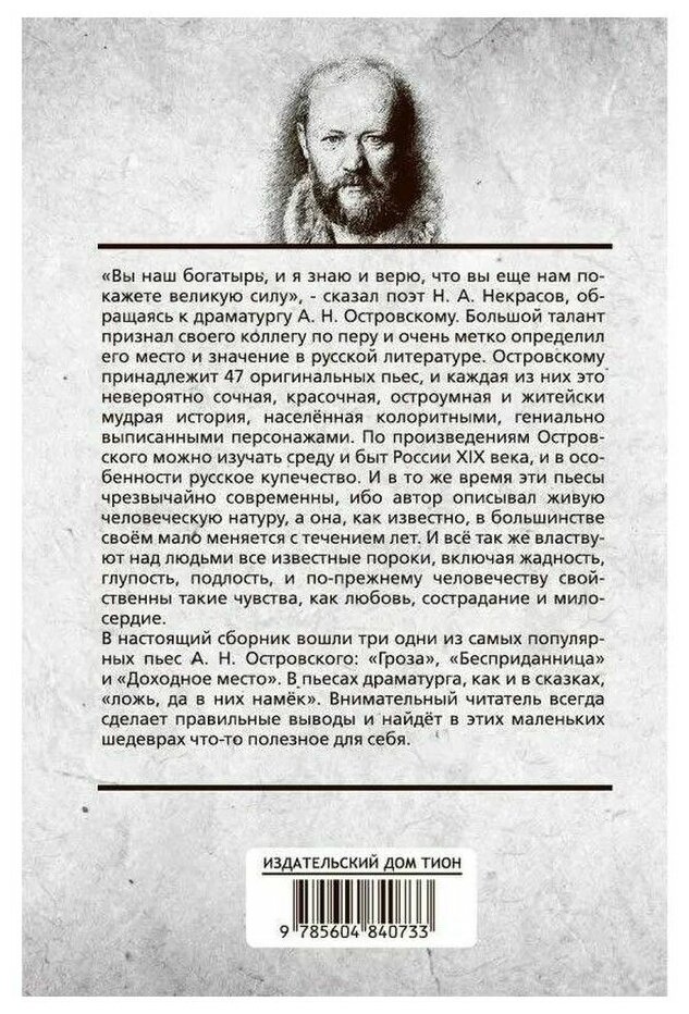 В настоящий сборник вошли три одни из самых популярных пьес А. Н. Островского: "Гроза", "Бесприданница" и "Доходное место". В пьесах драматурга, как и в сказках, "ложь, да в них намёк". Внимательный читатель всегда сделает правильные выводы и найдёт в этих маленьких шедеврах что-то полезное для себя.