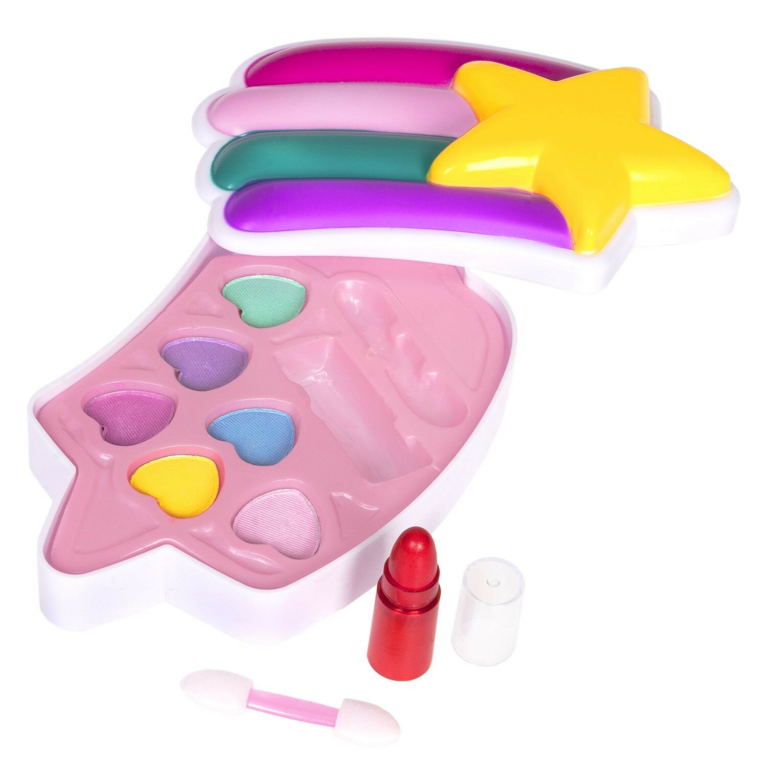 В наборе: косметичка-звёздочка, тени для век 6 оттенков (3,6г), помада (0,8г), аппликатор 1шт