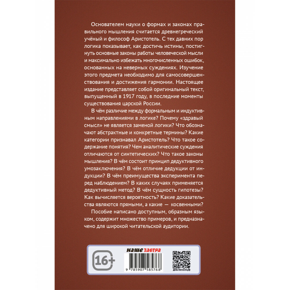 Основателем науки о формах и законах правильного мышления считается древнегреческий учёный и философ Аристотель. С тех давних пор логика показывает, как достичь истины, постигнуть основные законы работы человеческой мысли и максимально избежать многочисленных ошибок, основанных на неверных суждениях. Изучение этого предмета необходимо для самосовершенствования и достижения гармонии. Настоящее издание представляет собой оригинальный текст, выпущенный в 1917 году, в последние моменты существования царской России.
