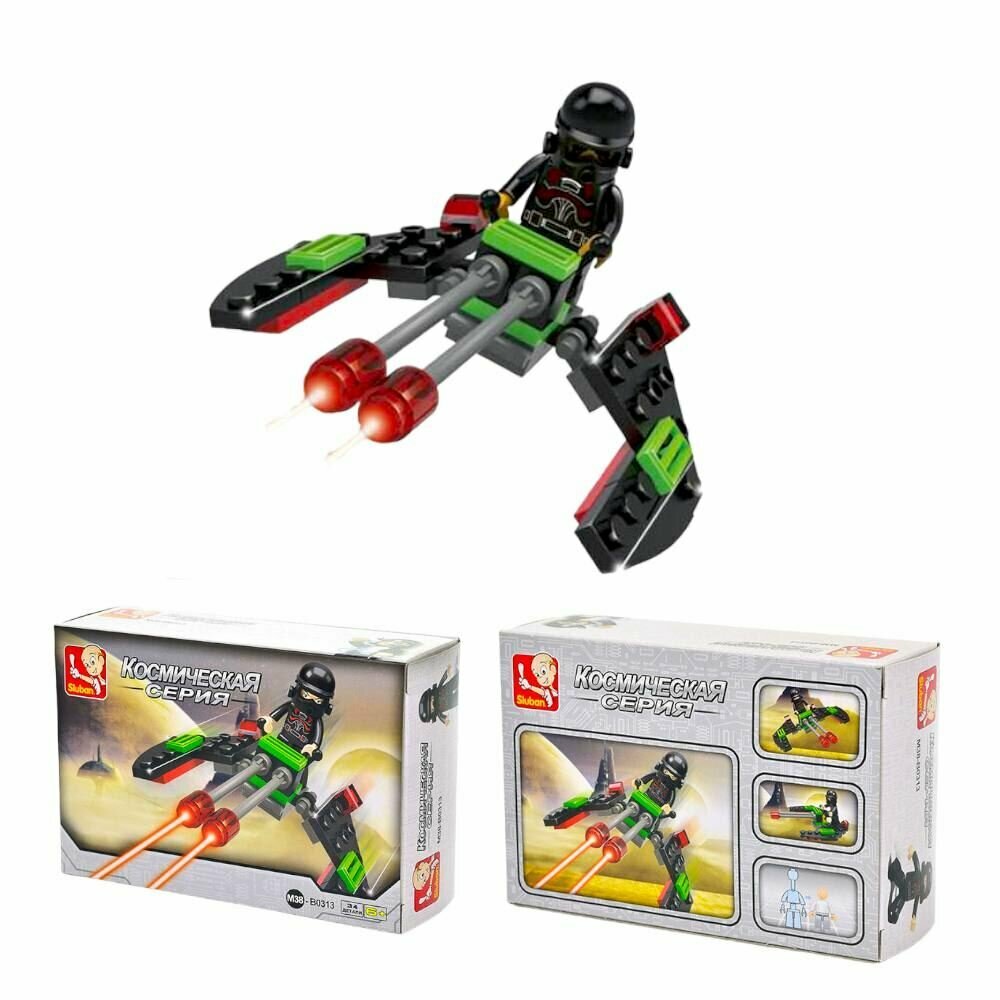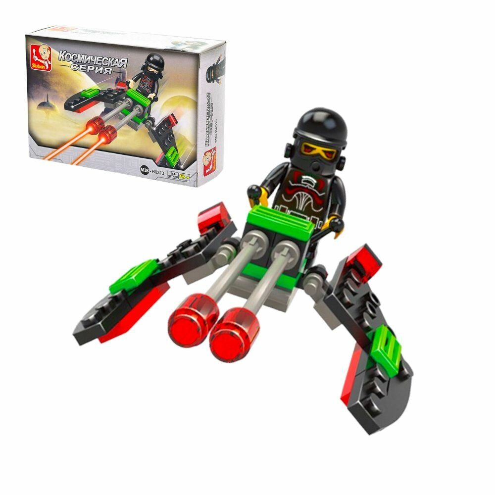Данный конструктор из 34 деталей позволяет собрать небольшой космический истребитель. Летательный аппарат покрашен в черные, красные и зеленые цвета, имеет подвижные крылья, а за его рулем находится минифигурка космического десантника в черном костюме и шлеме. Все детали набора совместимы с другими популярными конструкторами. Набор Sluban раздвигает границы воображения, к тому же изготовлен из прочного и безопасного пластика! Сборка конструкторов развивает логику, моторику пальцев и координацию движений, тренирует пространственное мышление и усидчивость, улучшает внимательность и терпение. Ребенок не только будет увлечен процессом сборки, но и сможет придумать множество игровых сюжетов с готовой моделью. Осталось собрать ее из конструктора Sluban!