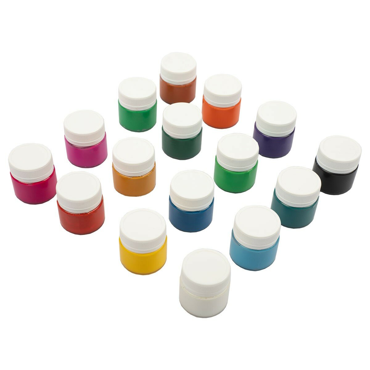 Состав набора: белый, желтый, охра, оранжевый, красный, розовый, фуксия, фиолетовый, голубой, синий, бирюзовый, изумрудный, зеленый, салатовый, коричневый, черный.