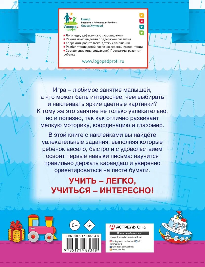 Игра - любимое занятие малышей, а что может быть интереснее, чем выбирать и наклеивать яркие цветные картинки? К тому же это занятие не только увлекательно, но и полезно, так как отлично развивает мелкую моторику, координацию и глазомер. В этой книге с наклейками вы найдёте увлекательные задания, выполняя которые ребёнок весело, быстро и с удовольствием освоит первые навыки письма: научится правильно держать карандаш и уверенно ориентироваться на листе бумаги.