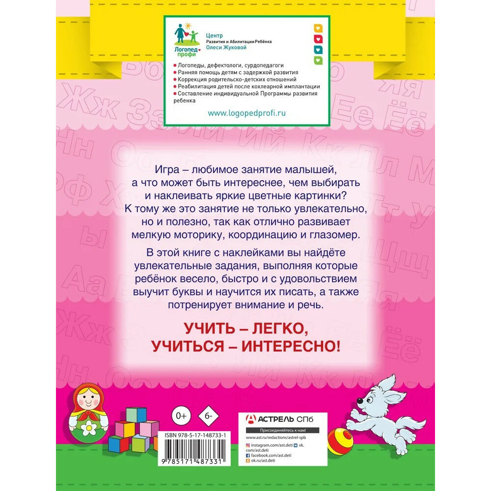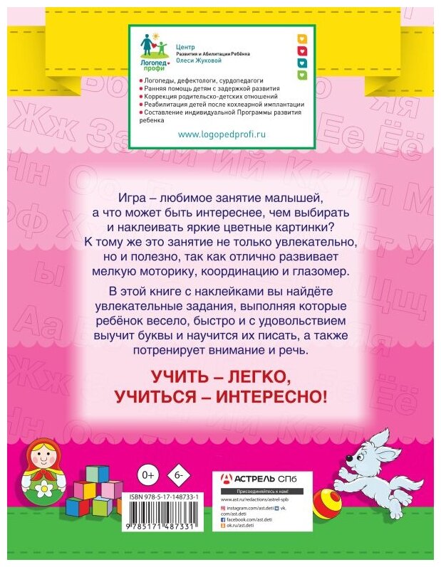 Игра – любимое занятие малышей, а что может быть интереснее, чем выбирать и наклеивать яркие цветные картинки? К тому же это занятие не только увлекательно, но и полезно, так как отлично развивает мелкую моторику, координацию и глазомер. В этой книге с наклейками вы найдёте увлекательные задания, выполняя которые ребёнок весело, быстро и с удовольствием выучит буквы и научится их писать, а также потренирует внимание и речь.