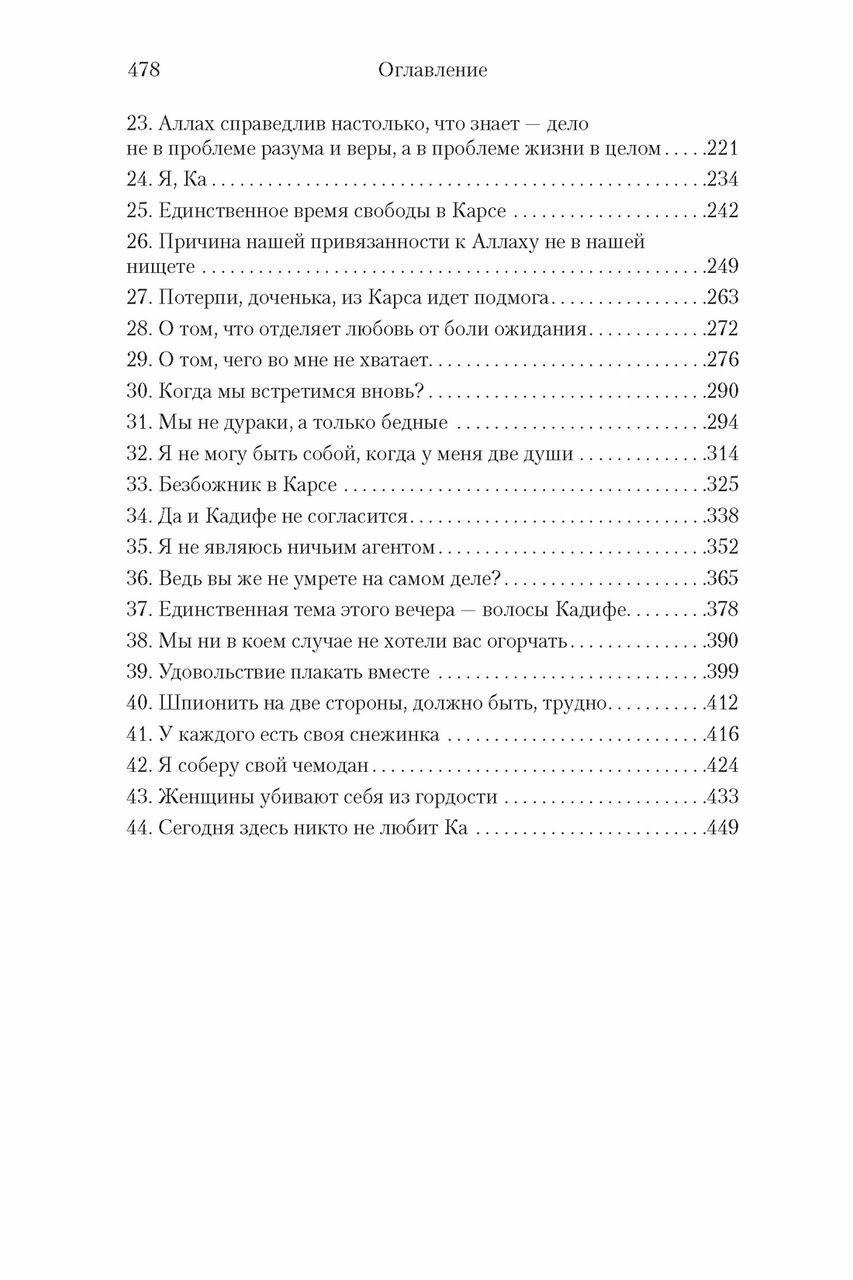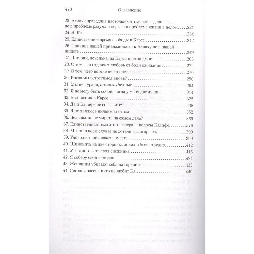 Прекрасный , глубокий роман,своеобразный текст,обладающий мощным ритмом. События развиваются в антураже заснеженного турецкого городка,в котором молодой журналист Керим исследует серию самоубийств молодых девушек. Город стал своеобразной ловушкой, снег завалил всё и уехать невозможно. Получился потрясающий фон ,складывающийся ещё и из мельчайших подробностей турецкого быта. В романе много времени уделяется размышлениям автора об особенном историческом пути турецкого народа , наследии османской культуры.
