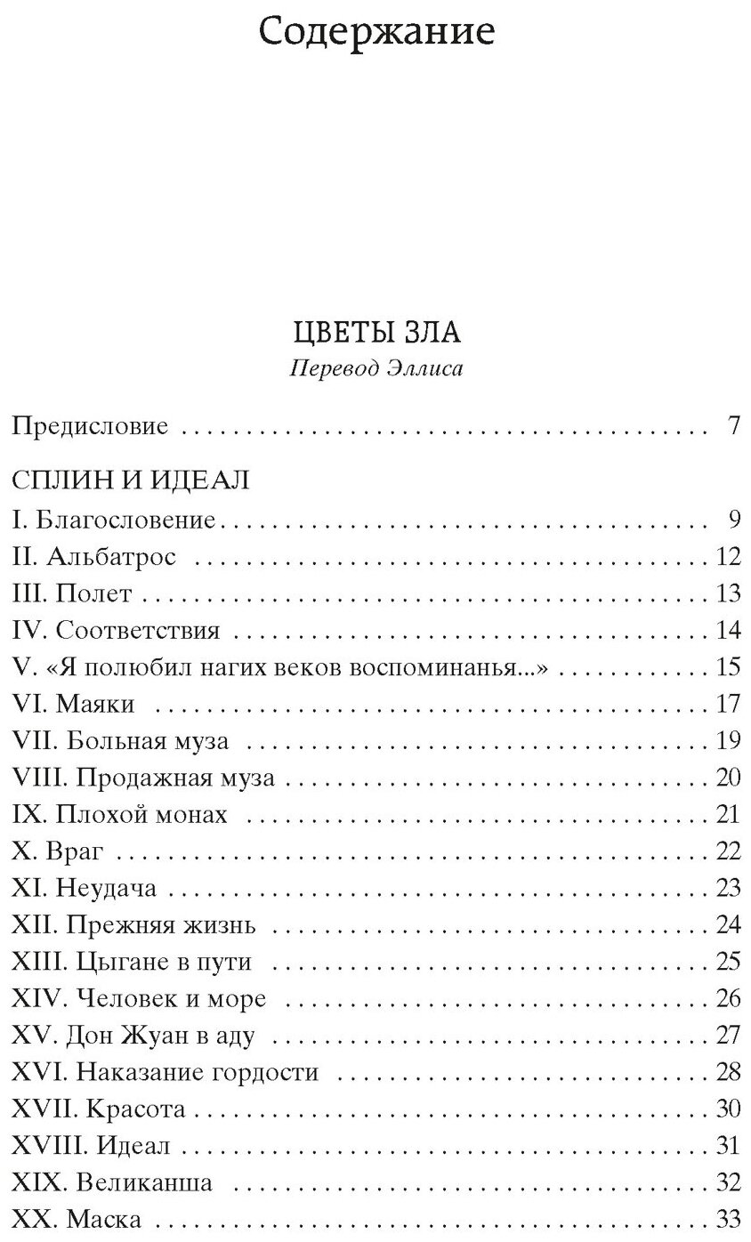 Главное достоинство - перевод. Я читал другое издание \"Цветов зла\", составленное из текстов разных переводчиков и похожее на пёстрое лоскутное одеяло. Здесь же все стихи основного сборника приводятся в переводе Эллиса, поэтому сразу чувствуется единый стиль, общая система образов. Цикл \"Сплин\" в его переводе особенно хорош, прямо чувствуешь, как Бодлера раздражала обыденная рутинная жизнь. Кроме того, не пропущен ни один текст, всё соответствует оригиналу.