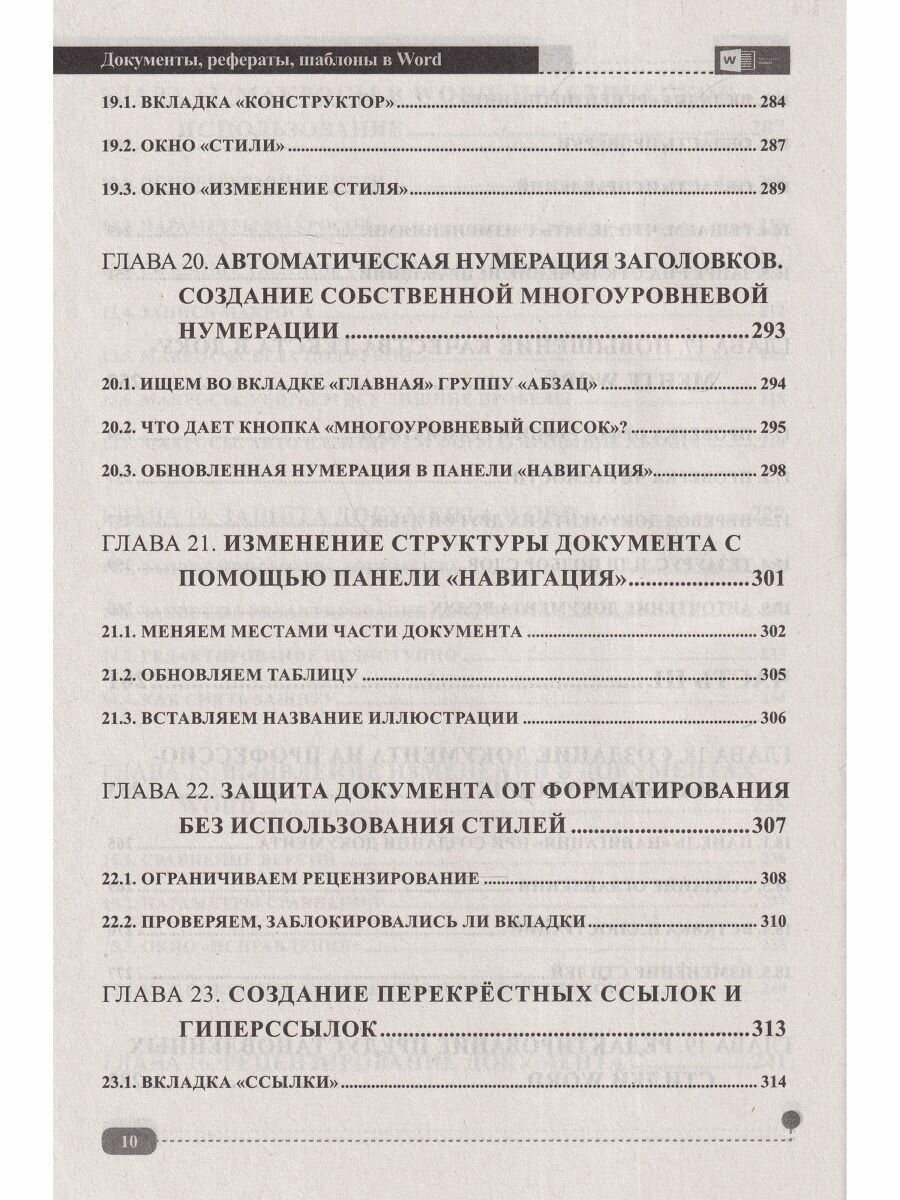 В этой книге вы узнаете: как создать статью, простой документ, служебный документ, уведомление, веб-страницу, бланк, буклет - все это поможет вам при работе с рефератом, отчетом, курсовой, дипломом или даже при создании собственной книги. Будет рассказано и показано как красиво оформить текст, выбрать стиль и цвет шрифта по своему вкусу, добавить в него картинку, звук и даже видео, вставить таблицы и произвести вычисления с помощью формул, как правильно использовать макросы (и зачем они вообще нужны), как защитить ваш документ от нежелательных правок и многое-многое другое.
