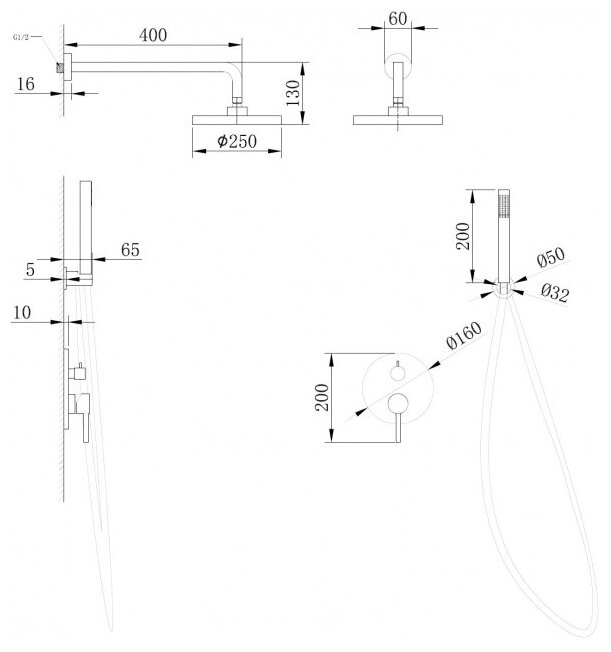 | Состав комплекта | верхний душ, смеситель, шланговое подключение, душевой гарнитур |