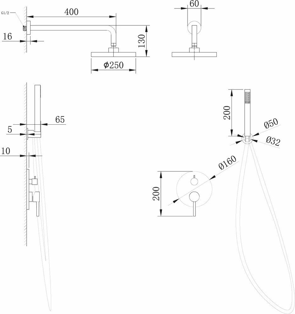 - Форма верхнего душа: круглая.