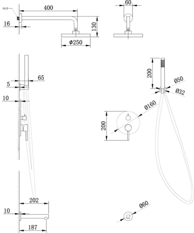 | Оснащение | Душевая лейка / Шланг для душа / Держатель душа / Кронштейн для верхнего душа / Шланговое подключение / Излив / Скрытая монтажная часть / Верхний душ / Смеситель |