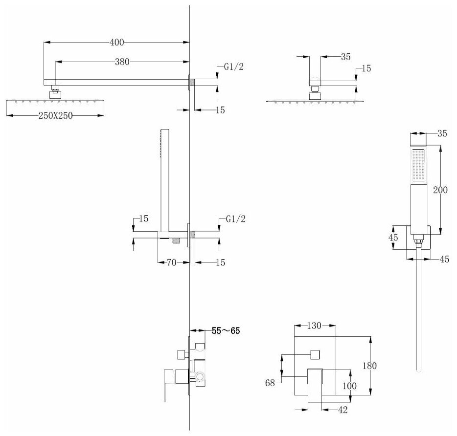 | Оснащение | Душевая лейка / Шланг для душа / Держатель душа / Кронштейн для верхнего душа / Шланговое подключение / Скрытая монтажная часть / Верхний душ / Смеситель |