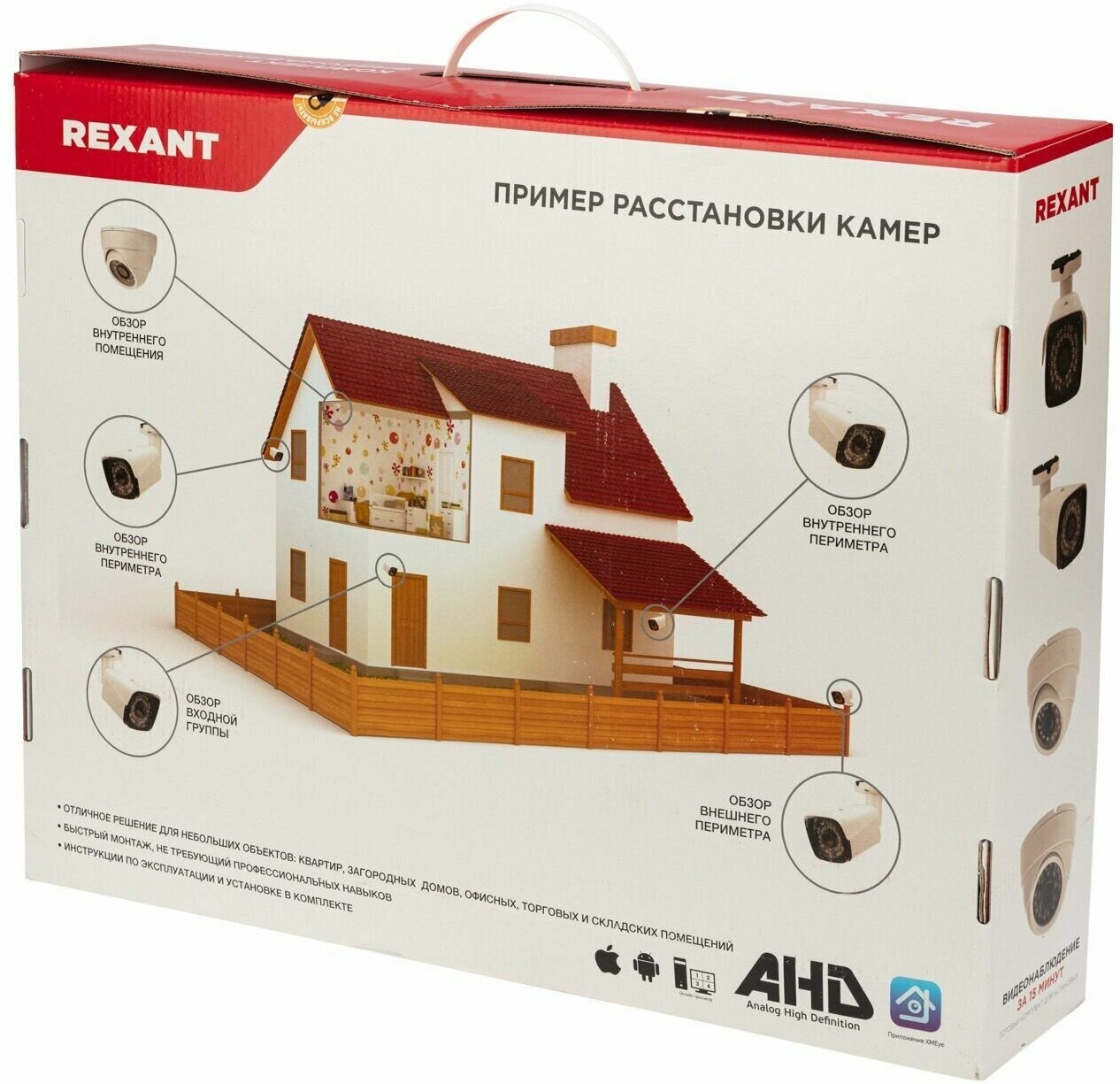 Готовый к установке комплект видеонаблюдения Rexant состоит из 4 купольных AHD видеокамер внутренней установки и 4-канального AHD-видеорегистратора.