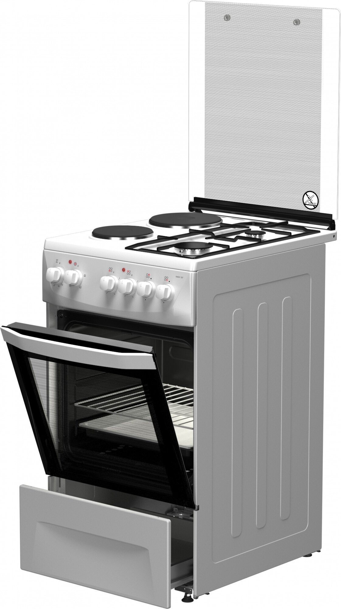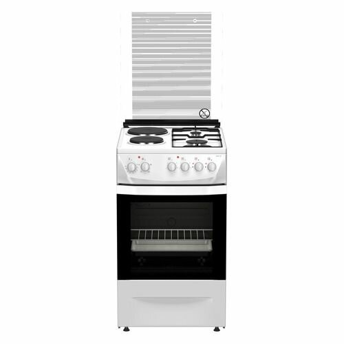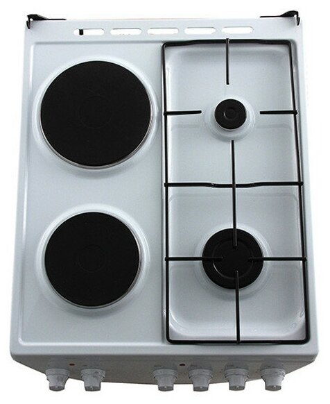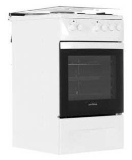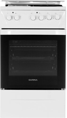 Комбинированная плита DARINA белого цвета способна работать и в качестве электрической плиты, и в качестве газовой, она вобрала в себя плюсы эксплуатации той и другой конструкции. На ее варочной поверхности разместились две газовые горелки и две электрические конфорки закрытого типа. Газовые конфорки быстрее приходят в рабочее положение и нагреваются, зато электрические более безопасны, они выручат Вас на Вашей домашней кухне в случае отсутствия подачи газа. Пониже панели управления плитой DARINA с поворотными переключателями находится небольшой духовой шкаф объемом 50 литров, он использует для своей работы электрический ток. Все газовые конфорки снабжены системой электроподжига, которая устраняет всякую необходимость в спичках и зажигалках для разжигания плиты.