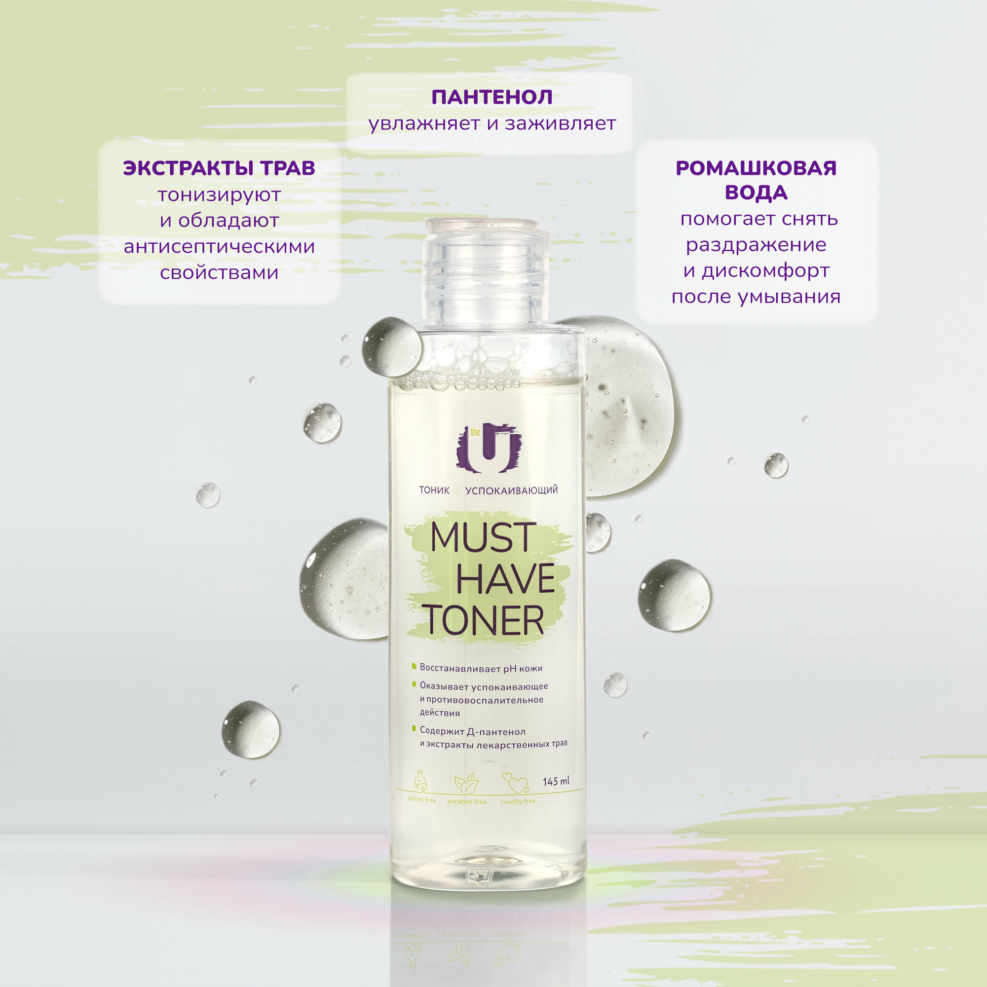 Тоник успокаивает и восстанавливает кожу, защищает ее от агрессивных факторов окружающей среды. Активные компоненты в составе заживляют кожу, придают ей гладкость и сияние, снимают раздражение. Средство нормализует pH кожи. Легкая текстура мгновенно впитывается, не оставляя на коже ощущения пленки. Средство подходит для ежедневного использования. Тоник можно применять в период использования кислот, ретинола и других раздражающих компонентов.