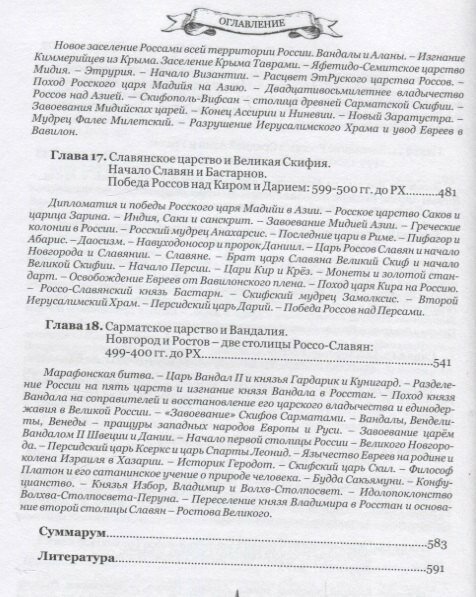 Уникальное библиографическое исследование о создании России с самых истоков, как древнейшего государства Мира. Книга преемственно продолжает исследования известных историков, прерванные с 1917 года. Хронология книги основана на заключительном труде святителя Димитрия Ростовского "Келейный летописец" (написан между 1705 и 1709 годами, издан в 1796 году) и полностью укладывается во временные рамки рукописи Р-235 А. Я. Артынова "Родословная славяно-русского народа, его царей, старейшин и князей от прародителя Ноя до великого князя Рюрика и князей Ростовских" (1888 год), а также широко известных архивных летописей и анналов, признанных научными историческими сообществами всего Мира.