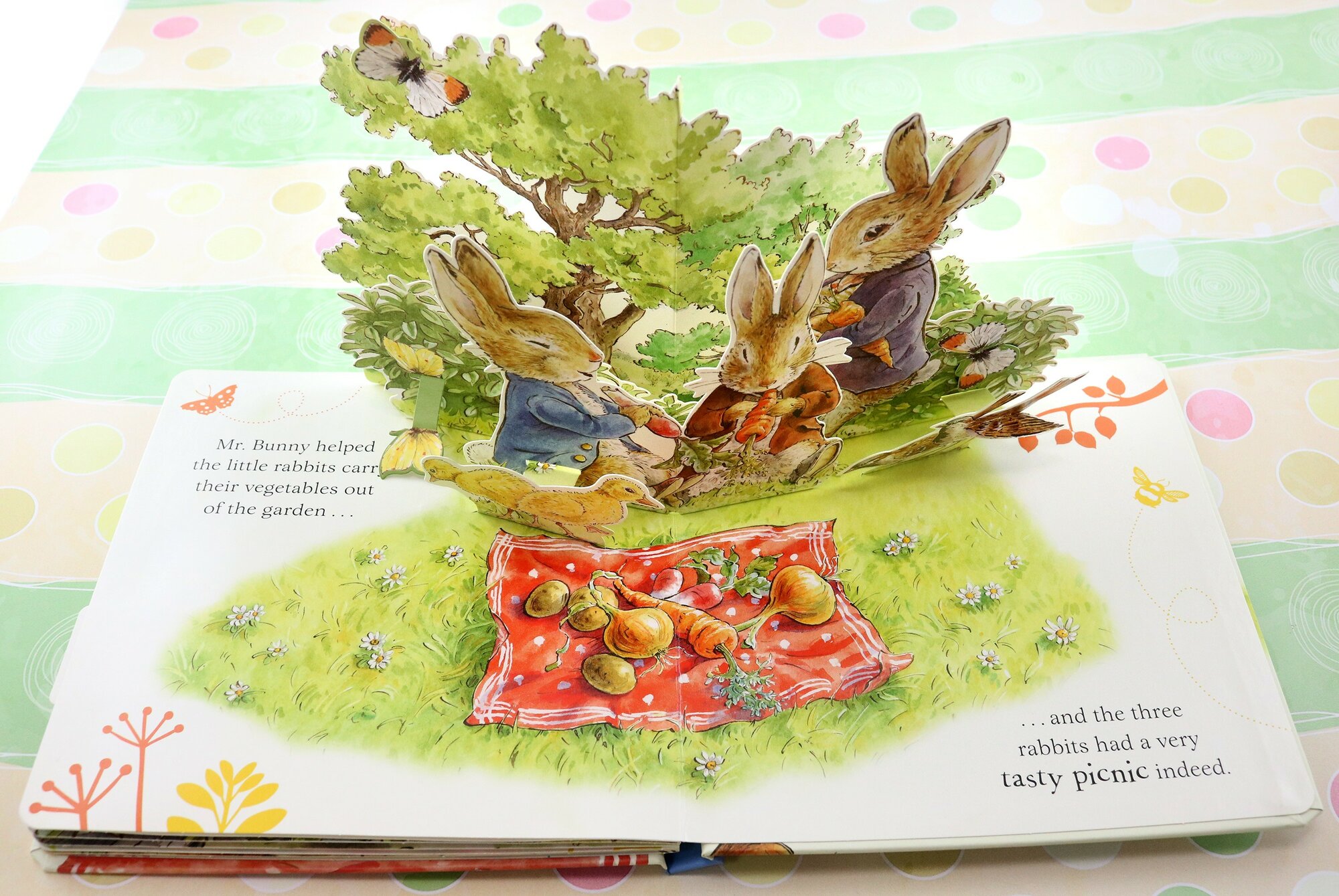 Peter and Benjamin are planning a picnic and where better to get some treats but Mr. McGregor's garden! Follow the pair under the gate using the slider, escape from a cat with a pull tab and enjoy the picnic in a final pop-up spread!
