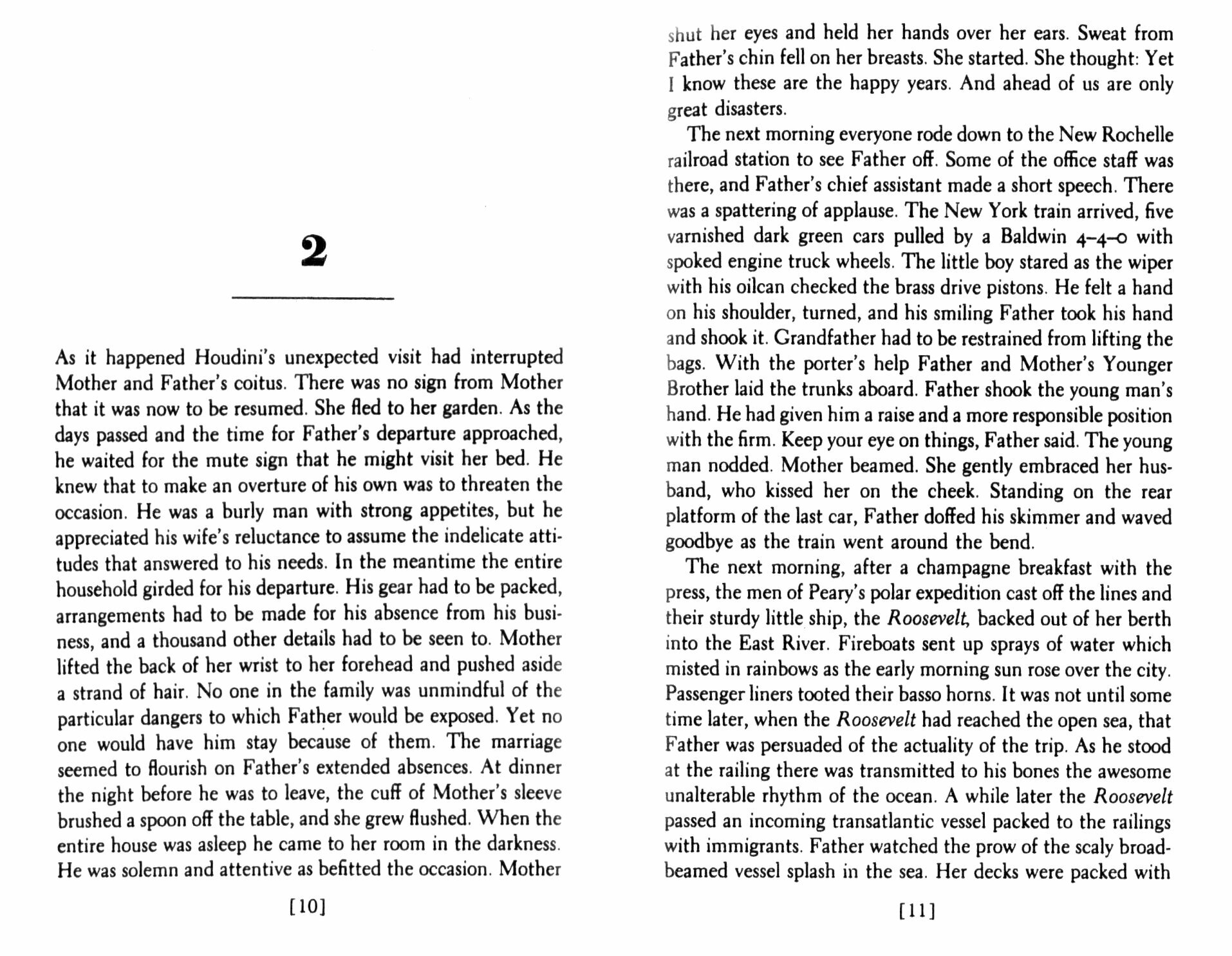 Просто потрясающе. Одна из лучших книг за долгое время. Прекрасно написанная и очень увлекательная, не хотелось, чтобы она заканчивалась (и это одна из причин, почему я так долго ее читаю). Очень умный сюжет и необыкновенная атмосфера. Доктороу просто мастерски сводит все концы с концами. Великолепное смешение фактов и вымысла. Замечательный роман.
