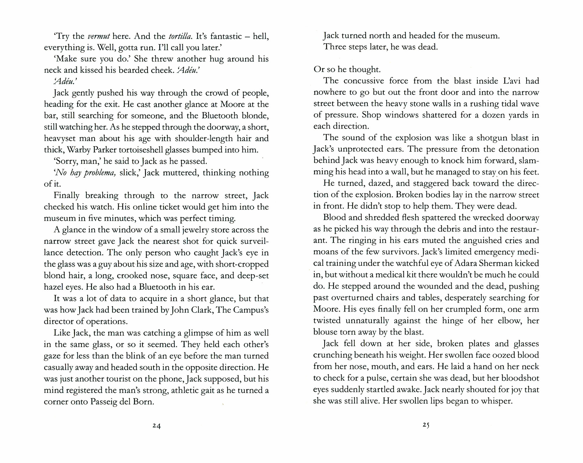 Dying in Jack's arms, Renee gasps a final word: 'Sammler'. Unsure who or what this is but not a believer in coincidences, he decides to investigate both Renee's reasons for being in Spain and the bombing itself.