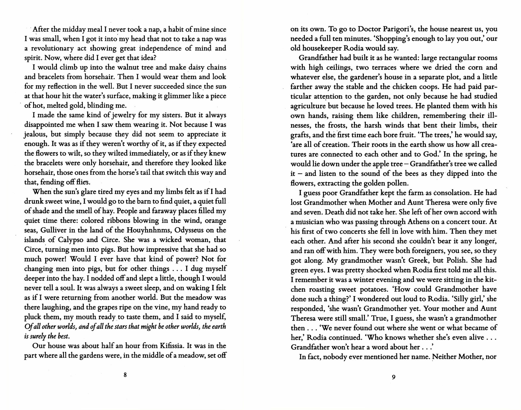 Three Summers is a warm and tender tale of three sisters growing up in the countryside near Athens before the Second World War. Living in a ramshackle old house with their divorced mother are flirtatious, hot-headed Maria, beautiful but distant Infanta, and dreamy and rebellious Katerina, through whose eyes the story is mostly observed. Over three summers, the girls share and keep secrets, fall in and out of love, try to understand the strange ways of adults and decide what kind of adults they hope to become.