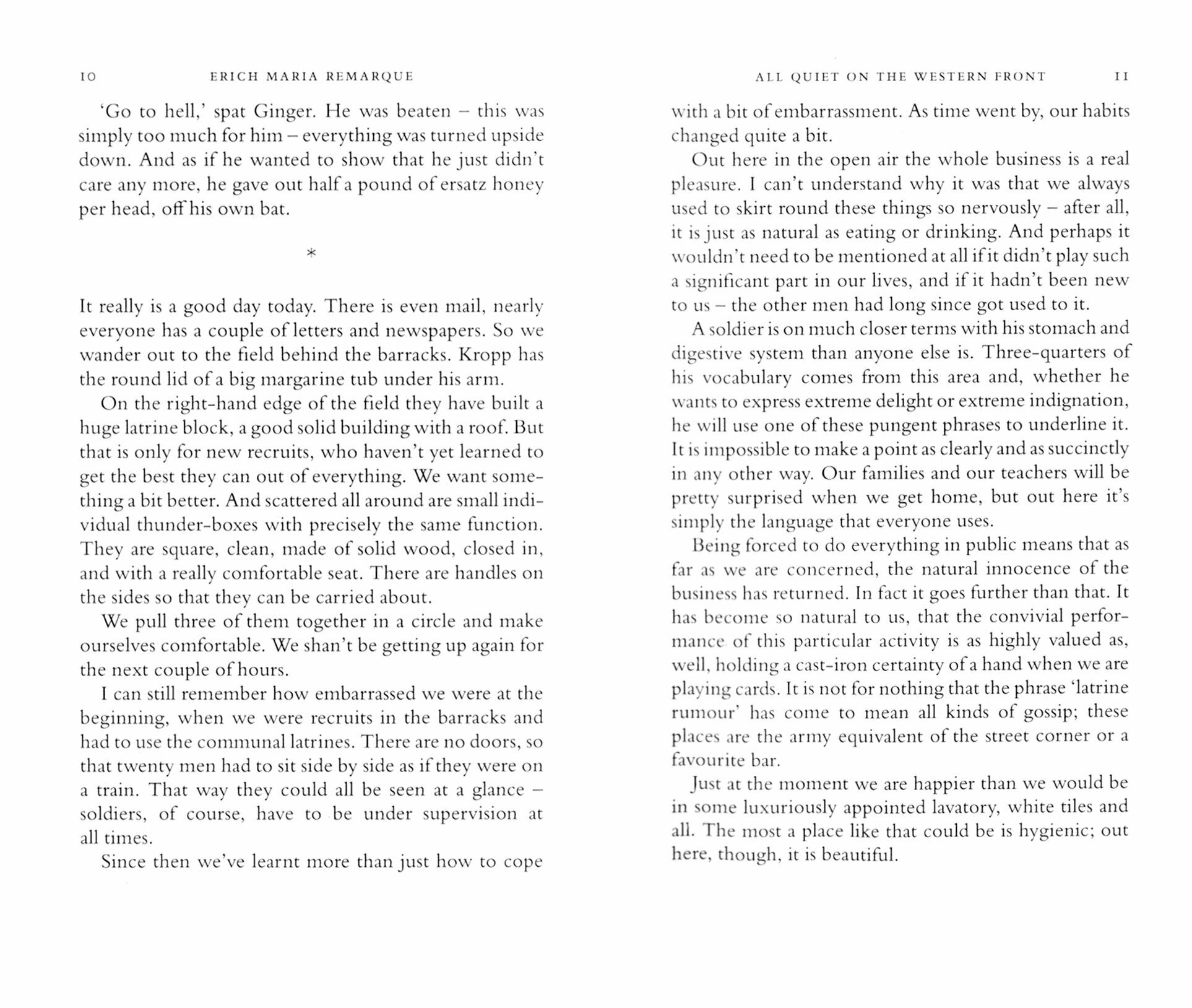 Remarque's elegy for a sacrificed generation is all the more devastating for the laconic prose in which his teenaged veteran narrates shocking experiences which for him have become the stuff of daily life. Paul cannot imagine a life after the war and can no longer relate to his family when he returns home on leave. Only the camaraderie of his diminishing circle of friends has any meaning for him. He comes especially to depend on an older comrade, Stanislaus Katczinsky, and one of the most poignant moments in the book is when he carries the wounded Kat on his back under fire to the field dressing station, with starkly tragic outcome.