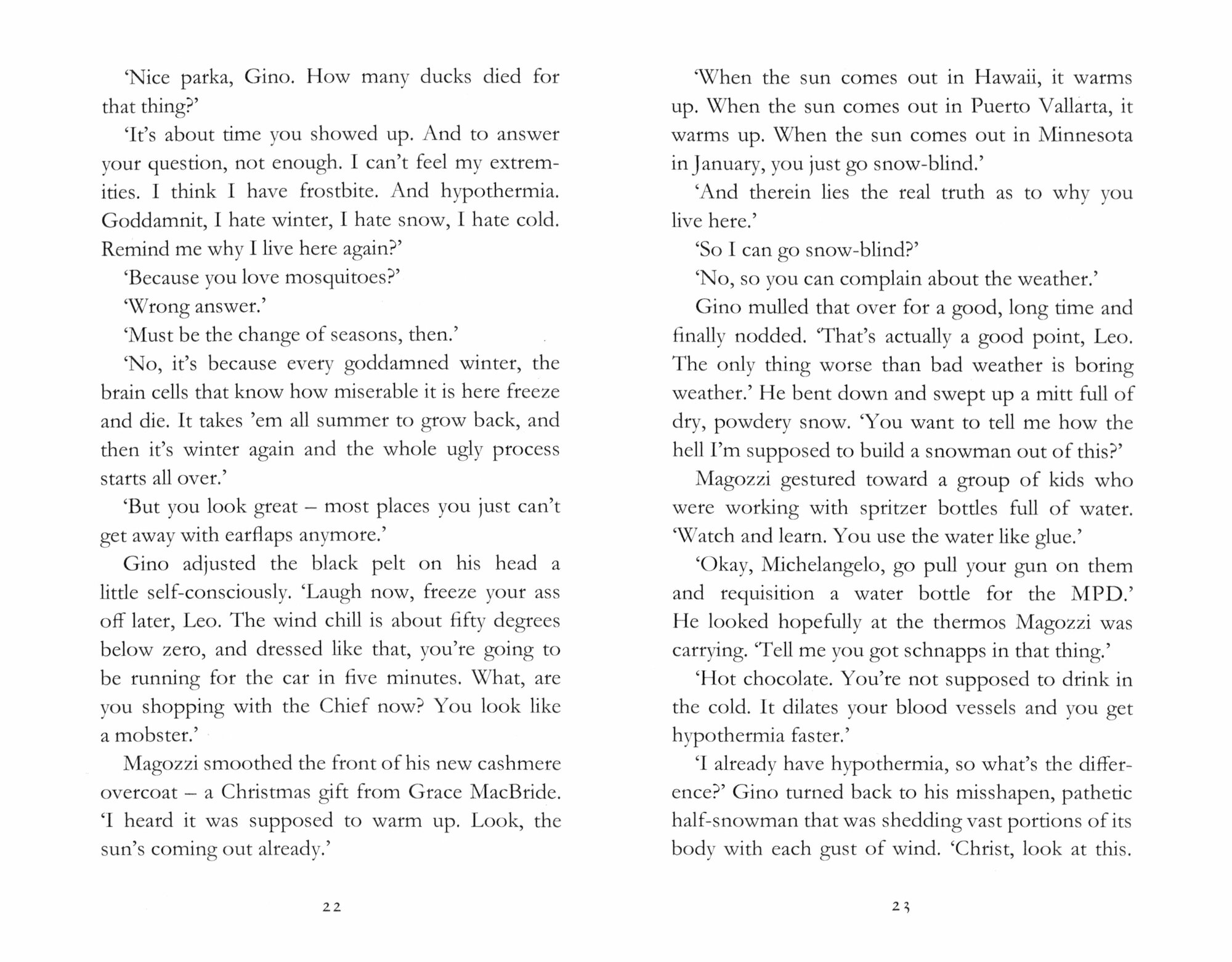 First, the bodies of two cops are found inside the snowmen and then a day later, in the countryside to the north, Sheriff Iris Rikker makes a similarly shocking discovery. Soon Detectives Gino and Magozzi are sent north through the worst blizzard Minnesota's seen for years to find what else links the investigations.