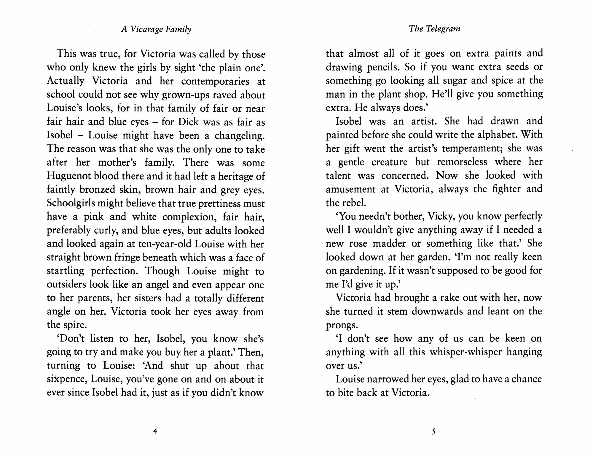 In the story there are three little girls - Isobel, the eldest, is pretty, gentle and artistic; Louise the youngest, is sweet and talented - and then there is Vicky, 'the plain one', the awkward and rebellious child who doesn't fit in at school or at home. Growing up in a big family Vicky feels overlooked but gradually begins to realize that she might not be quite as untalented as she feels.