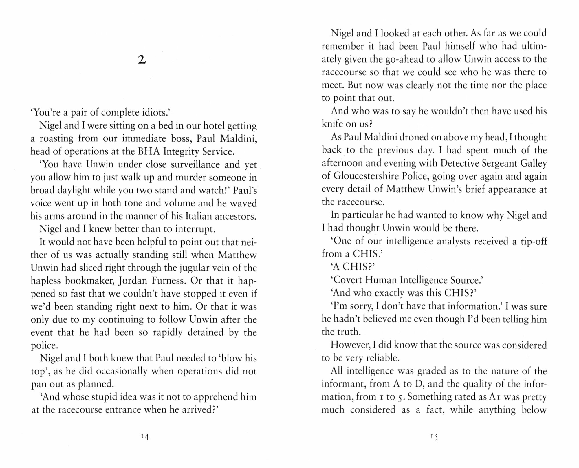 Jeff Hinkley, undercover investigator for the British Horseracing Authority, is looking into the shady activities of a racehorse trainer. But as he's tailing his quarry through the Cheltenham Racing Festival, the last thing he expects to witness is a gruesome murder. Could it have something to do with the reason the trainer was banned in the first place - the administration of illegal drugs to his horses?