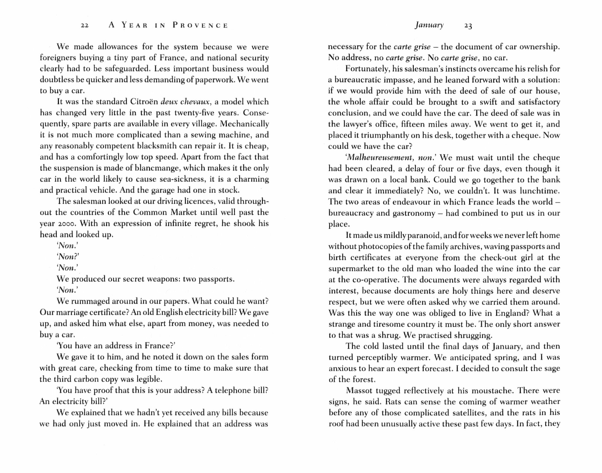 In a year that begins with a marathon lunch and continues with a host of gastronomic delights, they also survive the unexpected and often hilarious curiosities of rural life. From mastering the local accent and enduring invasion by bumbling builders, to discovering the finer points of boules and goat-racing, all the earthy pleasures of Provencal life are conjured up in this enchanting portrait.