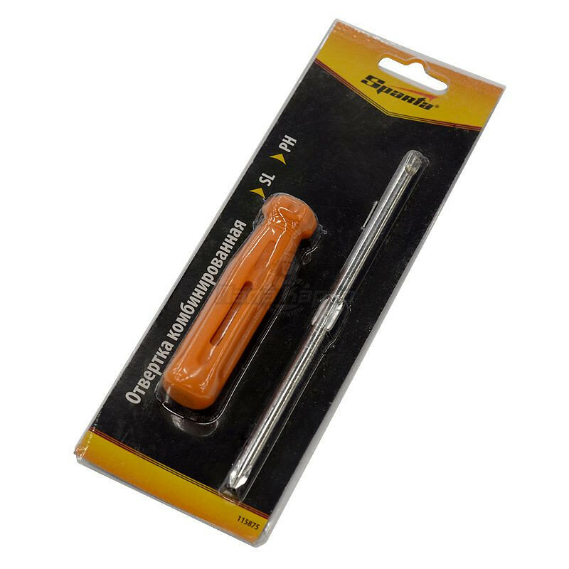 Комбинированная отвертка Sparta представляет собой сочетание пластиковой ручки с двухсторонним стержнем. Используется для проведения монтажных/демонтажных работ крепежных соединений. Инструмент подходит для работы с винтами, имеющими рабочие профили - крестовой и прямой шлиц.