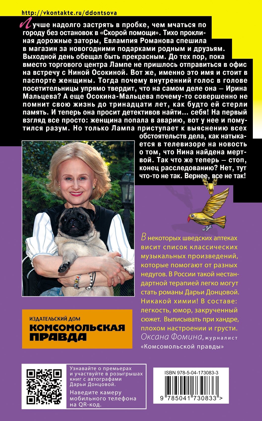 Лучше надолго застрять в пробке, чем мчаться по городу без остановок в «Скорой помощи». Тихо проклиная дорожные заторы, Евлампия Романова спешила в магазин за новогодними подарками родным и друзьям. Выходной день обещал быть прекрасным. До тех пор, пока вместо торгового центра Лампе не пришлось отправиться в офис на встречу с Ниной Осокиной. Вот же, именно это имя и стоит в паспорте женщины. Тогда почему внутренний голос в голове посетительницы упрямо твердит, что на самом деле она — Ирина Мальцева? А еще Осокина-Мальцева почему-то совершенно не помнит свою жизнь до тринадцати лет, как будто ей стерли память. И теперь она просит детективов найти… себя! На первый взгляд все просто: женщина попала в аварию, вот у нее и помутился разум. Но только Лампа приступает к выяснению всех обстоятельств дела, как натыкается в телевизоре на новость о том, что Нина найдена мертвой. Так что же теперь — стоп, конец расследованию? Нет, тут что-то не так. Вернее, все не так!
