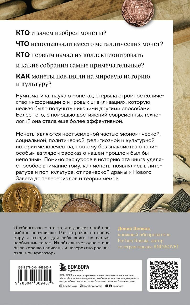Нумизматика, наука о монетах, открыла огромное количество информации о мировых цивилизациях, которую нельзя было получить никакими другими способами. Более того, с помощью достижений современных технологий она стала еще более эффективной. Монеты являются неотъемлемой частью экономической, социальной, политической, религиозной и культурной истории человечества, поэтому без знакомства с таким особым взглядом рассказ о нашем прошлом был бы неполным. Помимо экскурсов в историю эта книга уделяет особое внимание тому, как монеты появлялись в литературе и поп-культуре: от греческой драмы и Нового Завета до телесериалов и теории мемов.