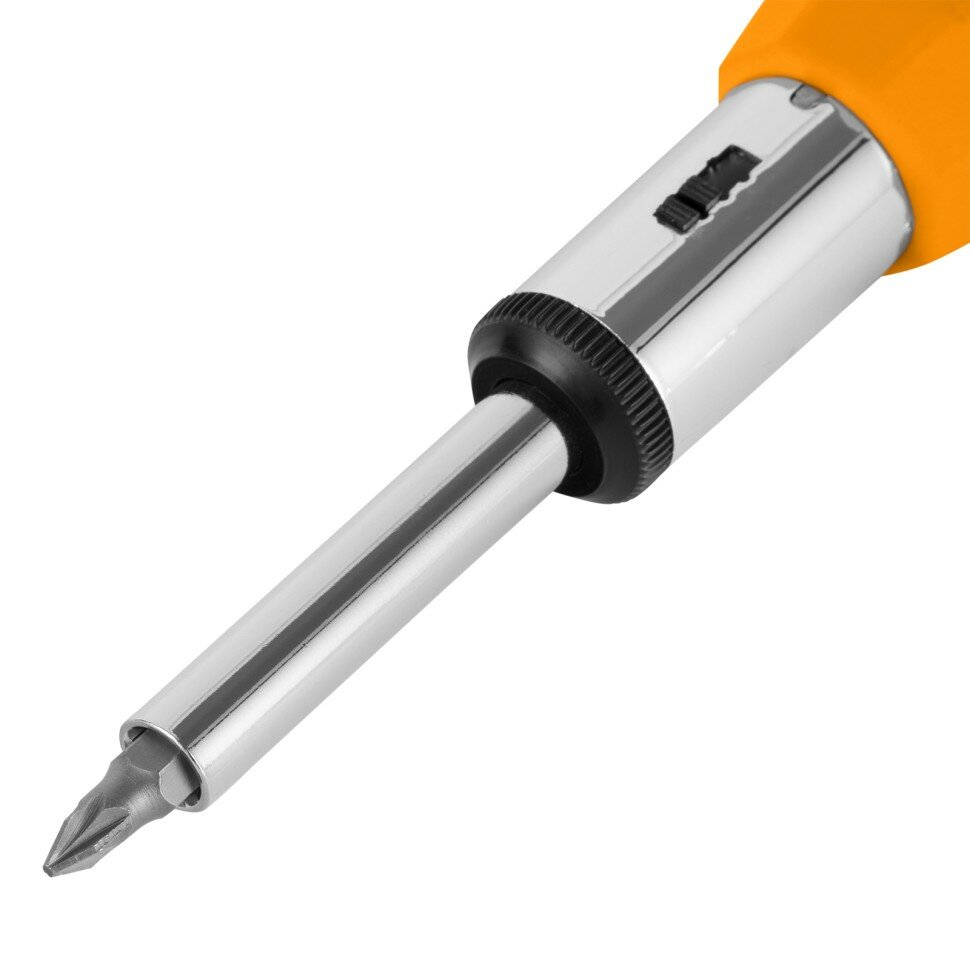 | Прочие особенности и свойства | Отвертка реверсивная с набором бит из хромванадиевой стали. Имеет магнитный фиксатор для бит и реверсивный механизм, позволяющий заворачивать и отворачивать крепеж без перехватывания ручки. Пластиковая рукоятка с резиновой нескользящей накладкой обеспечивает надежный захват и удобство в работе. В комплекте 9 бит с профилями:РН – №1, №2, № 3, PZ – №1, №2, №3, SL – 5, 6 и 7 мм. |
