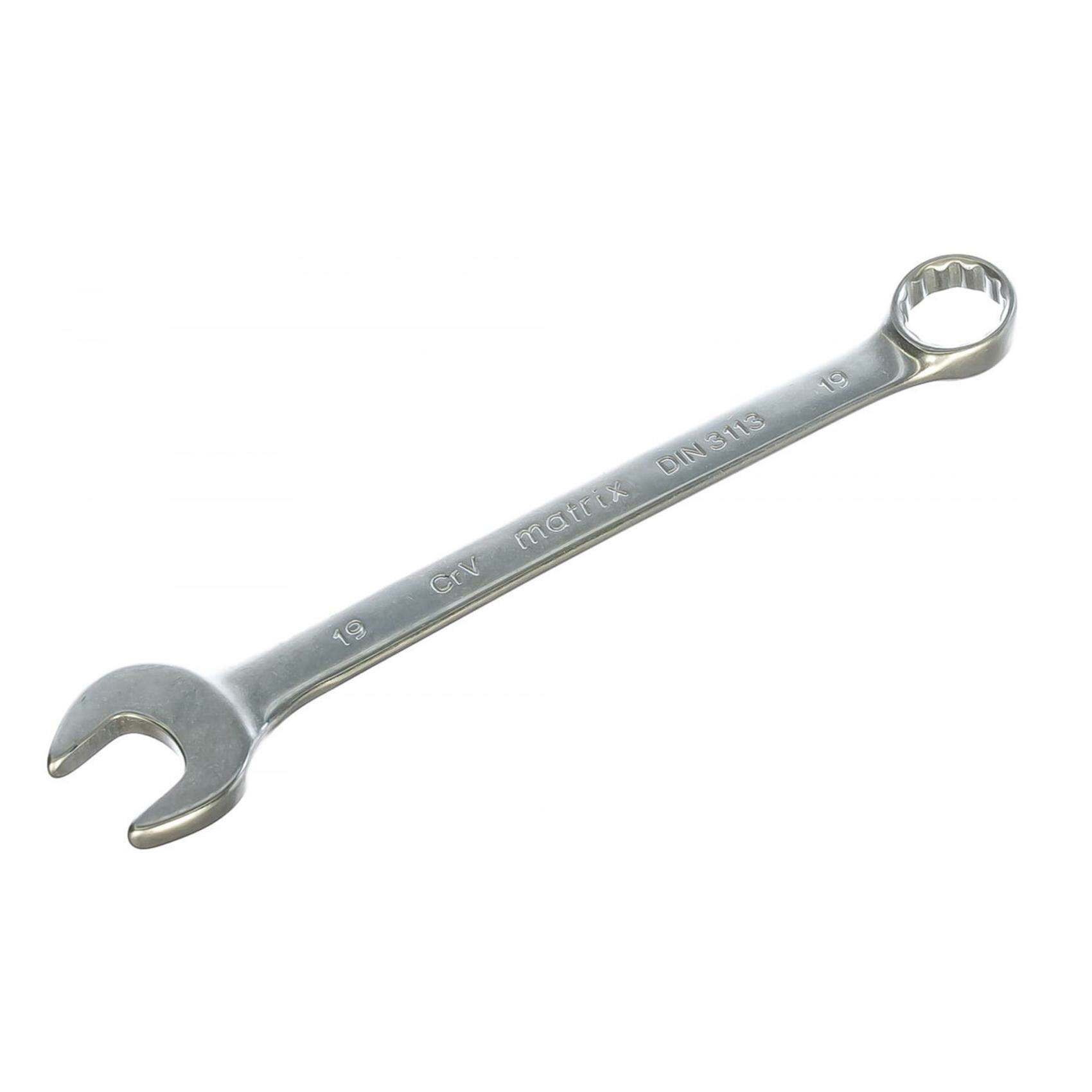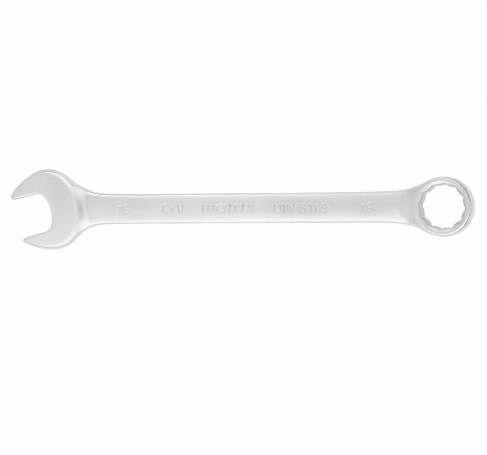 Комбинированный ключ 19 мм MATRIX применяется в работе с крепежными элементами, имеющими шестигранный профиль. Инструмент представляет собой сочетание двух видов зевов - открытого и кольцевого. Кольцевой зев имеет 12 граней, что обеспечивает более плотное соприкосновение рабочих поверхностей и снижает риск деформации граней крепежа. Твердость материала, из которого выполнен инструмент составляет 45 HRc, что соответствует требованиям ГОСТ.